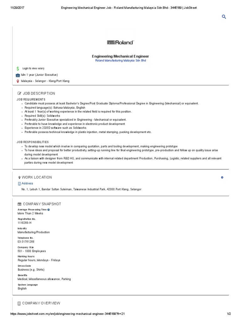 Engineering Mechanical Engineer Job Roland Manufacturing Malaysia Sdn Bhd 3445189 Jobstreet Mechanical Engineering Engineering